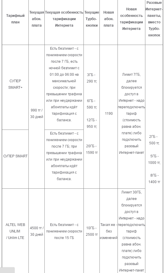 На "суперах" повышается абонплата - до 1190 тг, здесь также после завершения лимита в 7 ГБ нужно подключать будет подключать тариф заново или пользоваться разовым пакетом.