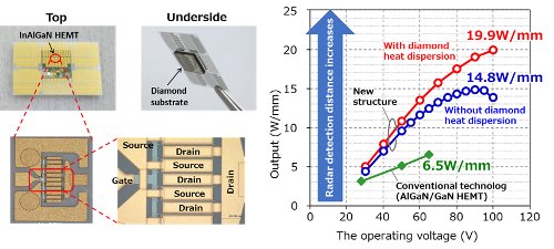 Основная идея японцев заключается в том, что напряжение должно подводиться к транзистору не точечно, непосредственно через электрод, а рассеянно. Запатентованная технология позволила добиться роста допустимой плотности мощности до 19.9 Вт/мм в GaN HEMT, использующим буферные слои InAlGaN.