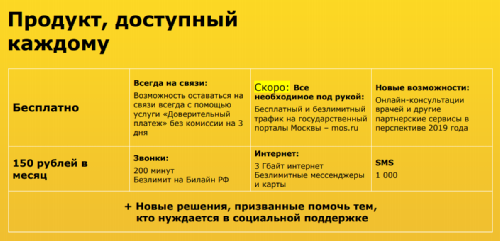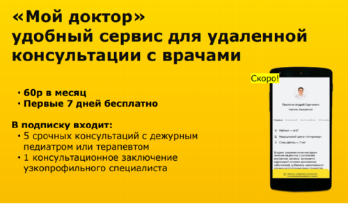 ИЛ: Также в тариф встраиваем онлайн-консультации у врачей. Билайн активно инвестирует в тему eHealth. Для маломобильных людей, беременных, людей пенсионного возраста будет актуальна возможность удаленной консультации со специалистами. Первые 7 дней бесплатно, далее по 60 рублей в месяц. В подписку входит 1 срочная консультация с врачом-специалистом. Мы общались с потребителями, которые уже пользовались этими сервисами, они отзываются положительно, говорят, что очень удобно. Эта услуга будет добавлена уже в мае.