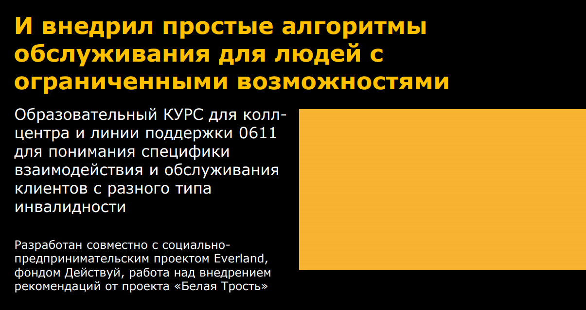 ИЛ: Мы регулярно сообщаем о том, когда проходят собрания, где мы рассказываем, как работать по скриптам, предназначенным для организации обслуживания абонентов с инвалидностью. Делимся опытом, как отличать людей с особыми потребностями, как с ними взаимодействовать. Может быть это интересно вам, может быть у вас есть знакомые из других крупных компаний, мы готовы делиться опытом. Поможем поднять культуру сервиса.