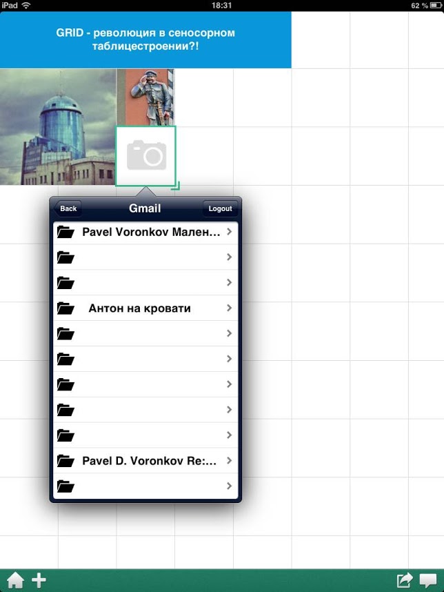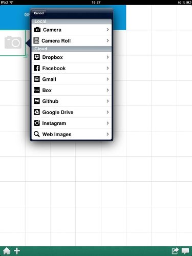Изображения можно взять из фотопленки, из семи «облачных» сервисов на выбор, найти в Интернете с помощью кнопки поиска или сделать снимок, не покидая приложения. Мне понравилась возможность вставить фото из Gmail: письма сканируются, и отображаются только те, в которые вложены картинки.