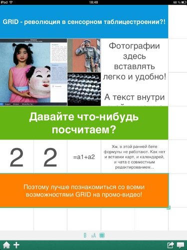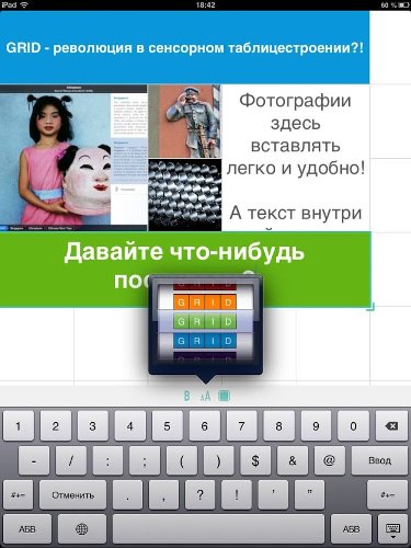 Скажем, нужны ли обладателям iPad кальки Adobe Lightroom? Такие есть, но пользоваться ими очень неудобно. Желающие редактировать фотографии на планшете выбирают Snapseed. В итоге востребованными окажутся продукты, созданные «с нуля» с учетом современных реалий. Такие, как GRID. «Новое поколение» - не просто громкие слова. За этим термином здесь скрывается: 1) новая система ввода и новый тип интерфейса; 2) новые возможности просмотра и взаимодействия с документом; 3) новое понимание того, зачем в мобильных гаджетах нужны табличные редакторы.