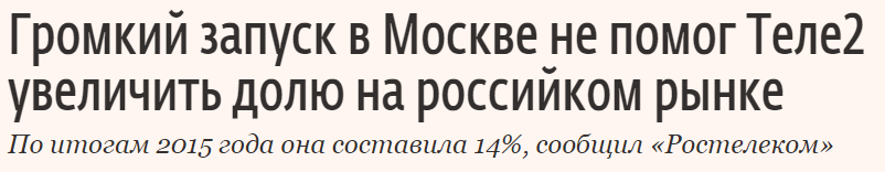 Суть новости в том, что по данным Ростелекома, который в свою очередь ссылается на данные "ТМТ консалтинг" (Константин Анкилов), компания осталась при той же доле рынка по числу абонентов, несмотря на эффектный и эффективный выход в Москву. Это может свидетельствовать только об одном - продолжается сокращение числа абонентов совместного предприятия в других регионах. В Tele2 результаты 4q2015 не комментируют, поскольку компания их еще не обнародовала. Я тоже предпочел бы их дождаться прежде, чем делать какие-то выводы.
