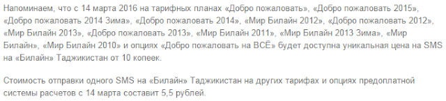 Стоимость отправки одного SMS на «Билайн» Таджикистан на других тарифах и опциях предоплатной системы расчетов с 14 марта составит 5,5 рублей.